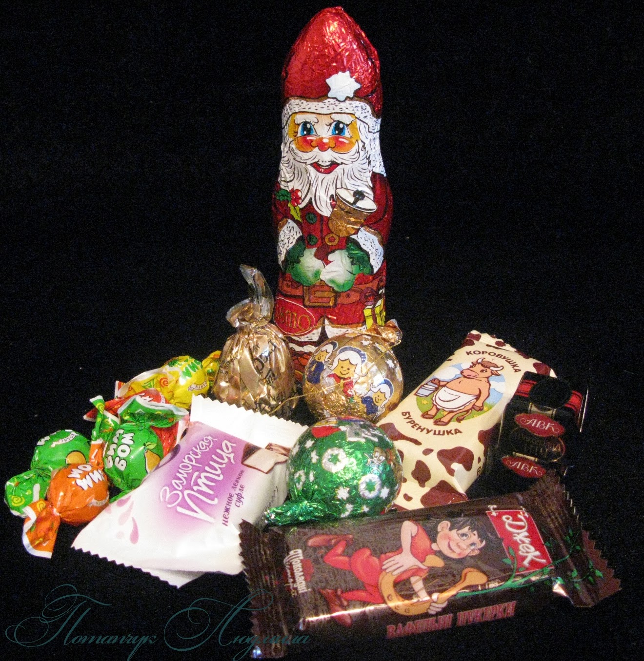Конфеты используются самые разнообразные, в основном Рошен "Трюфель Коньяк", "Трюфель Шампанское", АВК "Фундук в шоколаде". Всего не менее 7 штук.